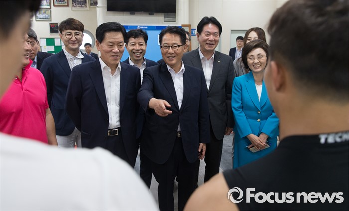 | △ 역도 국가대표 선수들 격려하는 박지원 |