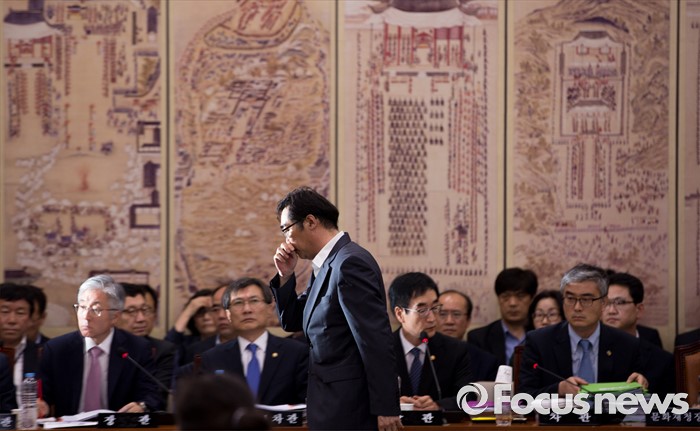 (서울=포커스뉴스) 민중을 개, 돼지로 표현한 발언으로 비판을 받고 있는 나향욱 교육부 정책기획관이 11일 오후 서울 여의도 국회에서 열린 교육문화체육관광위원회 전체회의에 참석해 교문위원들의 질의를 받기 위해 연단으로 향하고 있다.
