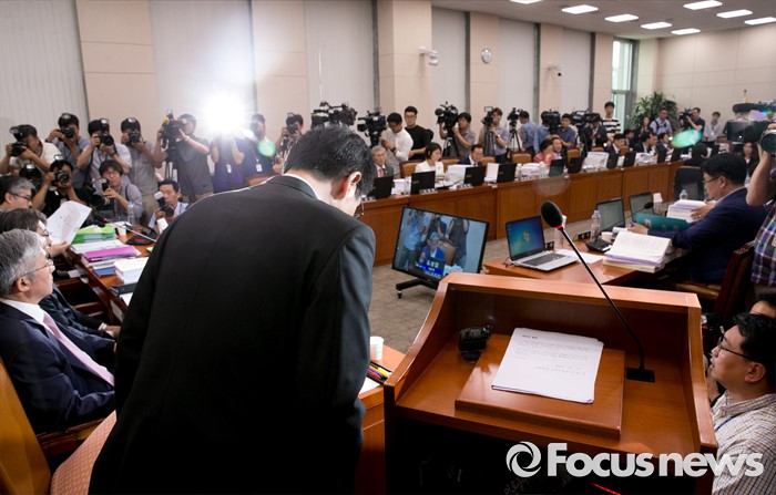 (서울=포커스뉴스) 11일 오후 서울 여의도 국회에서 열린 교육문화체육관광위원회 전체회의에 참석한 이준식 사회부총리 겸 교육부 장관이 "민중은 개·돼지"라고 발언해 물의를 빚은 나향욱 교육부 정책기획관과 관련 허리 숙여 사과하고 있다.