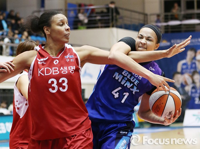 각 구단은 정규리그 개막 한 달 전인 9월 말 외국인선수를 불러들인다.(구리=포커스뉴스) 지난 2월24일 구리시체육관에서 열린 2015~2016 여자프로농구 KDB생명-삼성생명 경기에서 삼성생명 스톡스가 리바운드 볼을 잡은후 KDB생명 플레네트와 팔이 엉키고 있다. 2016~2017 시즌 스톡스와 플레네트는 함께 KB스타즈 유니폼을 입는다. 2016.02.24 우정식 기자