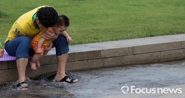 (서울=포커스뉴스) 올해 들어 첫 열대야가 발생한 11일 오후 서울 여의도 한강공원을 찾은 시민들이 더위를 피해 물놀이를 하고 있다.