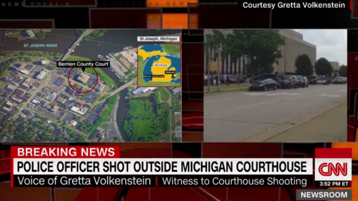 릭 스나이더 주지사는 트위터를 통해 "현재 미시간주 경찰이 총격사건 현장 주변을 모두 통제하고 사건 경위를 조사하고 있다"고 밝혔다.11일(현지시간) 미국 미시간주 세인트 조지프시 법원에서 총격사건이 발생했다. <사진출처=CNN>