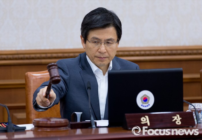 (서울=포커스뉴스) 황교안 국무총리가 12일 오전 정부서울청사에서 국무회의 시작을 알리며 의사봉을 두드리고 있다.