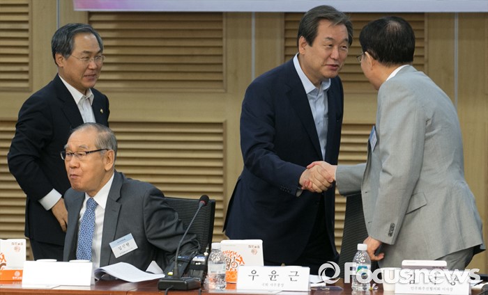 (서울=포커스뉴스) 12일 오전 서울 여의도 국회 의원회관에서 국가전략포럼 주최로 열린 국민이 바라는 개헌, 어떻게 할 것인가? 세미나에 참석한 김무성 새누리당 전 대표와 김덕룡 민주화추진협의회 이사장이 인사하고 있다. 오른쪽부터 김 이사장, 김 전 대표, 김진현 세계평화포럼 이사장, 우윤근 국회 사무총장.