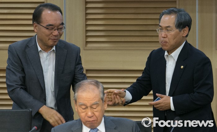 (서울=포커스뉴스) 12일 오전 서울 여의도 국회 의원회관에서 국가전략포럼 주최로 열린 국민이 바라는 개헌, 어떻게 할 것인가? 세미나에 참석한 우윤근(오른쪽) 국회 사무총장과 박재완 한반도선진화재단 이사장이 인사하고 있다.