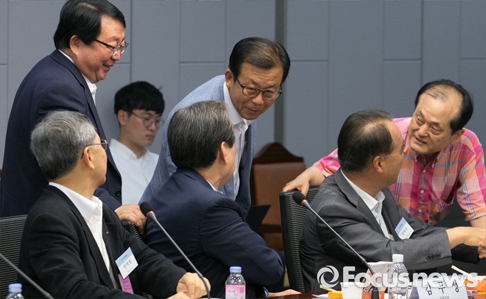 (서울=포커스뉴스) 12일 오전 서울 여의도 국회 의원회관에서 국가전략포럼 주최로 열린 국민이 바라는 개헌, 어떻게 할 것인가? 세미나에 참석한 김무성(앞줄 왼쪽 두번째) 새누리당 전 대표와 원혜영(뒷줄 왼쪽 두번째) 더불어민주당 의원이 인사하고 있다.