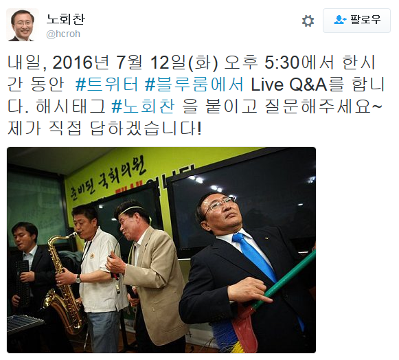2009년 7월 처음 트위터를 시작한 노회찬 원내대표는 7년 동안 꾸준히 트위터에 의정활동 현황과 다양한 사안들에 대한 의견을 남기며 대국민 소통에 힘써왔다. 국내 정치인·행정가 중 4번째로 많은 약 71만명의 팔로워를 보유하고 있으며, 2015년에는 국내 오피니언 리더 중에서 3번째로 빠른 팔로워 증가세를 보이기도 했다.노회찬 의원의 라이브 Q&A 공지 트윗 <사진제공=트위터코리아>