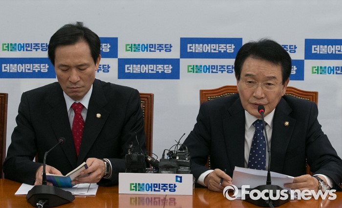 (서울=포커스뉴스) 12일 오전 서울 여의도 국회에서 열린 더불어민주당 원내대책회의에 참석한 변재일 정책위의장이 모두발언을 하고 있다. 왼쪽은 우상호 원내대표.