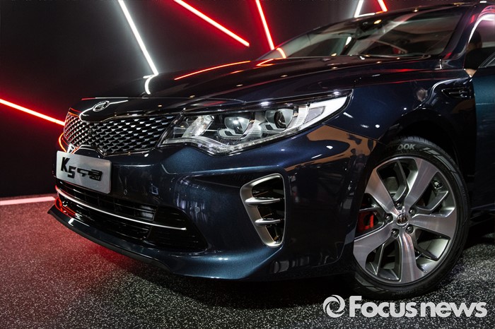 (서울=포커스뉴스) 12일 오전 서울 강남구 인터와이드 스튜디오에서 열린 '2017 K5, K5 PHEV' 출시 사진 및 영상 발표회에 K5 GT-Line 차량이 전시되어 있다.