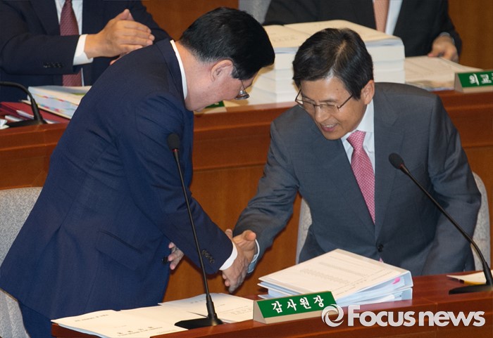 (서울=포커스뉴스) 12일 오전 서울 여의도 국회에서 2015회계연도 결산을 위해 열린 예산결산특별위원회 전체회의에 참석한 황교안(오른쪽) 국무총리와 황찬현 감사원장이 인사하고 있다.