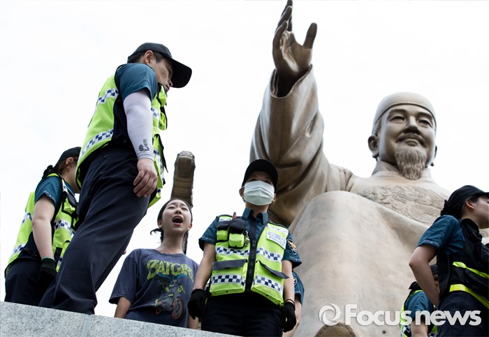 (서울=포커스뉴스) 12일 오전 서울 종로구 광화문광장 세종대왕 동상에서 알바연대알바노조가 최저임금 1만원 인상을 요구하며 기습시위를 벌이고 있다.
