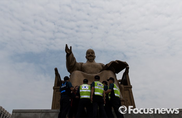 (서울=포커스뉴스) 12일 오전 서울 종로구 광화문광장 세종대왕 동상에서 알바연대알바노조가 최저임금 1만원 인상을 요구하며 기습시위를 벌이고 있다.