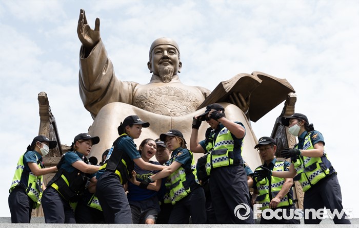 (서울=포커스뉴스) 12일 오전 서울 종로구 광화문광장 세종대왕 동상에서 최저임금 1만원 인상을 요구하며 시위를 하던 알바연대알바노조가경찰에게 연행되고 있다.