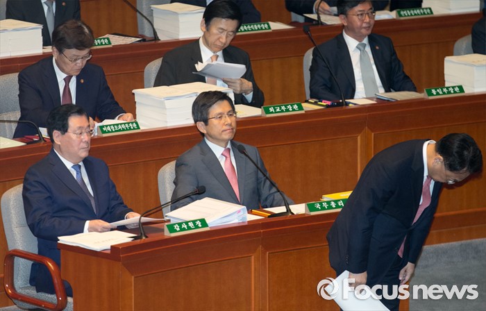 (서울=포커스뉴스) 12일 오전 서울 여의도 국회에서 2015회계연도 결산을 위해 열린 예산결산특별위원회 전체회의에 참석한 유일호(앞줄 오른쪽) 경제부총리 겸 기획재정부 장관이 제안설명을 마친 뒤 인사하고 있다.