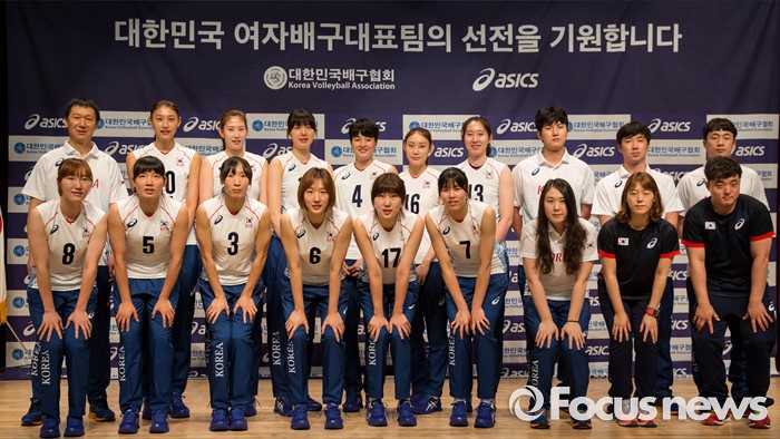 (진천=포커스뉴스) 12일 오전 충북 진천 선수촌 대강당에서 열린 '대한민국 여자배구 국가대표선수단 기자회견'에 참석한 이정철 감독, 코칭스태프 및 선수들이 포즈를 취하고 있다. 이날 기자회견을 가진 여자배구 선수단은 리우올림픽을 대비해 23일 네덜란드로 전지훈련을 떠날 계획이다.