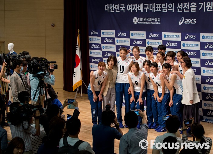(진천=포커스뉴스) 12일 오전 충북 진천 선수촌 대강당에서 열린 '대한민국 여자배구 국가대표선수단 기자회견'에 참석한 선수들이 포즈를 취하고 있다. 이날 기자회견을 가진 여자배구 선수단은 리우올림픽을 대비해 23일 네덜란드로 전지훈련을 떠날 계획이다.