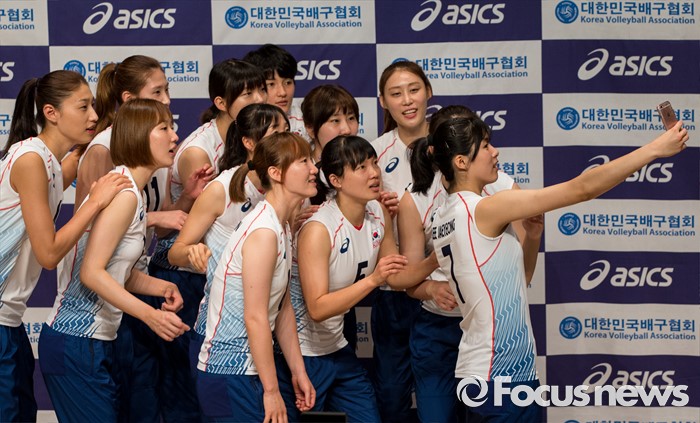 (진천=포커스뉴스) 12일 오전 충북 진천 선수촌 대강당에서 열린 '대한민국 여자배구 국가대표선수단 기자회견'에 참석한 선수들이 포즈를 취하고 있다. 이날 기자회견을 가진 여자배구 선수단은 리우올림픽을 대비해 23일 네덜란드로 전지훈련을 떠날 계획이다.