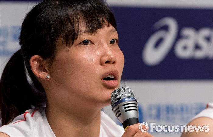 (진천=포커스뉴스) 12일 오전 충북 진천 선수촌 대강당에서 열린 '대한민국 여자배구 국가대표선수단 기자회견'에 참석한 김해란 선수가 각오를 밝히고 있다. 이날 기자회견을 가진 여자배구 선수단은 리우올림픽을 대비해 23일 네덜란드로 전지훈련을 떠날 계획이다.