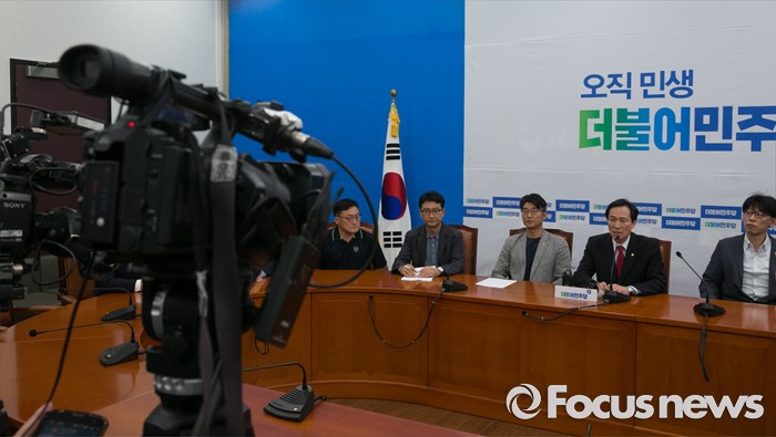 (서울=포커스뉴스) 우상호 더불어민주당 원내대표가 12일 오전 서울 여의도 국회에서 열린 MB정권 이후 해직언론인과의 면담에 참석해 인사말을 하고 있다.