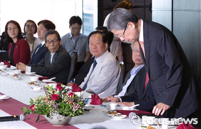 (서울=포커스뉴스) 김희옥 새누리당 혁신비대위원장이 12일 오후 서울 여의도 한 중식당에서 열린 상임고문단 오찬에 참석해 모두발언에 앞서 인사하고 있다.