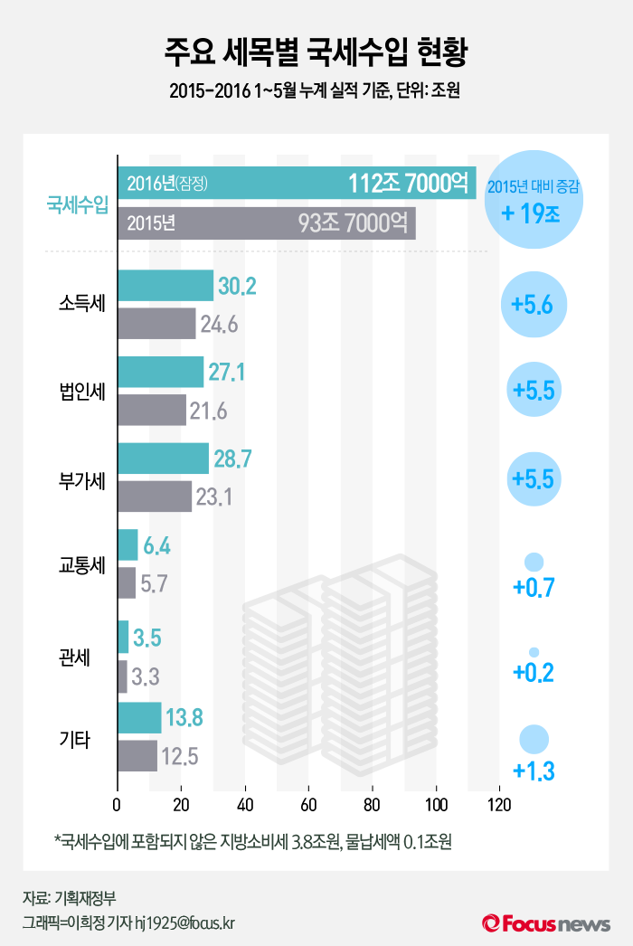 (서울=포커스뉴스) 12일 기획재정부가 발간한 ‘월간 재정동향’에 따르면 올해 1월부터 5월까지 국세수입은 112조7000억원으로 전년보다 20.3%(19조) 늘었다.