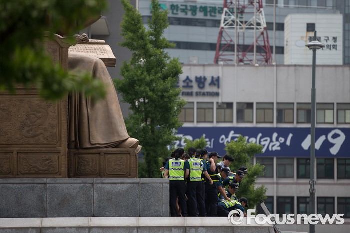 (서울=포커스뉴스) 12일 오전 서울 종로구 광화문광장 세종대왕 동상에서 알바연대알바노조가 최저임금 1만원 인상을 요구하며 기습시위를 벌이고 있다.