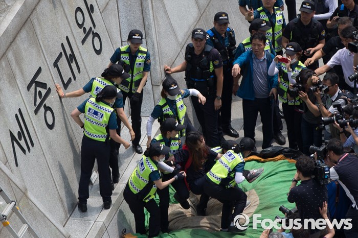 (서울=포커스뉴스) 12일 오전 서울 종로구 광화문광장 세종대왕 동상에서 알바연대알바노조가 최저임금 1만원 인상을 요구하며 기습시위를 벌이던 중 경찰들에게 제지당하고 있다.
