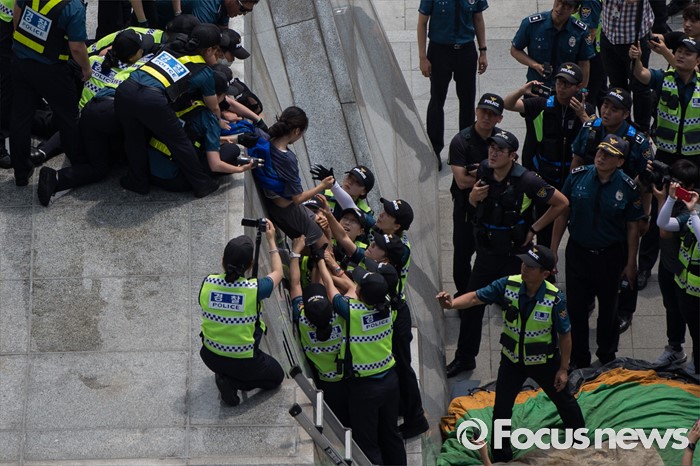 (서울=포커스뉴스) 12일 오전 서울 종로구 광화문광장 세종대왕 동상에서 알바연대알바노조가 최저임금 1만원 인상을 요구하며 기습시위를 벌이던 중 경찰들에게 제지당하고 있다.