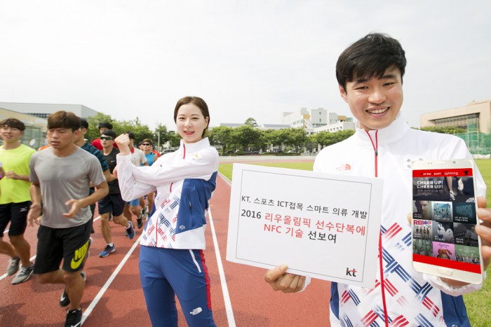 (서울=포커스뉴스) KT는 12일 노스페이스(영원아웃도어)와 함께 NFC(근거리 무선통신 기반) 기술을 접목한 운동복을 개발했다. 해당 기술은 2016 리우 올림픽 대회에 출전하는 대한민국 국가대표 선수단 ‘팀코리아(Team Korea)’ 선수단복에 적용될 예정이다.