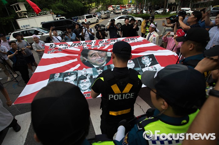 | △ 아베와 전범 얼굴 인쇄된 대형 현수막 |