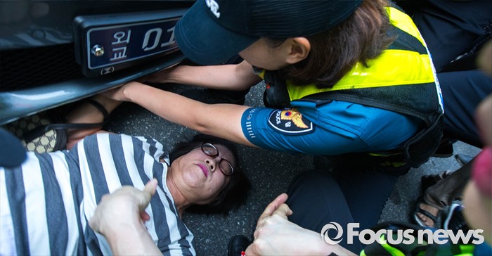 (서울=포컷뉴스) 12일 오후 서울 중구 밀레니엄서울힐튼호텔 앞에서 '일본 자위대 62주년 창설 기념식'을 규탄하는 시민단체들의 시위가 열리고 있는 가운데 한 시민이 행사장으로 들어선 외교 차량을 막고 누워 있다.