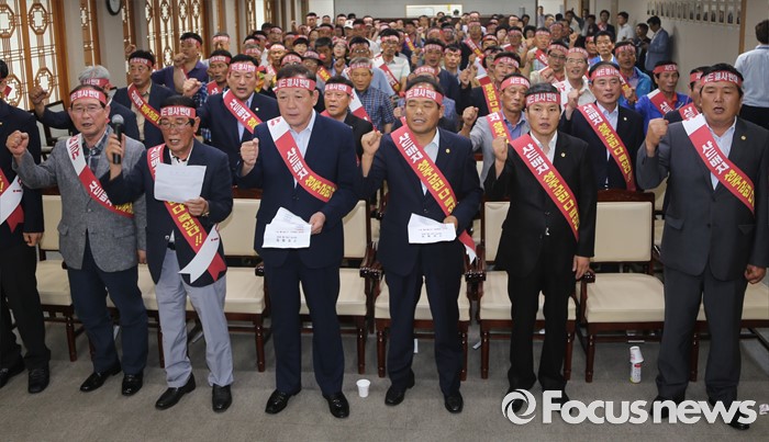 한편 성주군은 13일 오전 10시 30분에 성주읍 성밖숲에서 '사드 배치반대 범군민궐기대회'를 가질 예정이다. 궐기대회가 끝나면 김항곤 군수를 비롯한 대책위원회는 버스 10대를 타고 국방부를 항의 방문 할 예정이다.12일 오후 경북 성주군 성주읍 성주군청에서 열린 '사드 성주 배치 반대 범군민비상대책위원회' 발대식에서 비대위원들이 성주 사드 배치 반대 구호를 외치고 있다. (사진제공=성주군)2016.07.12 포커스포토