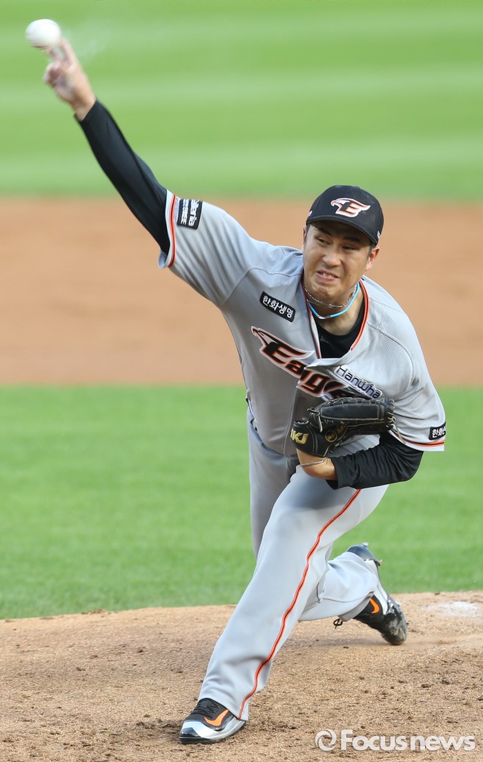 (서울=포커스뉴스) 12일 서울 잠실구장에서 열린 2016 프로야구 한화-LG 경기에서 한화 투수 장민재가 1회말 2사 1루에서 선발 송신영을 구원 등판해 투구하고 있다.