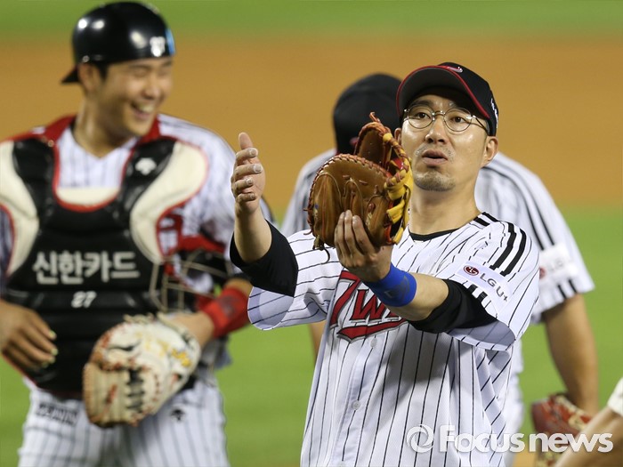 (서울=포커스뉴스) 12일 서울 잠실구장에서 열린 2016 프로야구 한화-LG 경기에서 한화에 5-4, 1점차 짜릿한 역전승을 거둔 LG의 정성훈이 오지환의 마지막 포구를 흉내내고 있다.