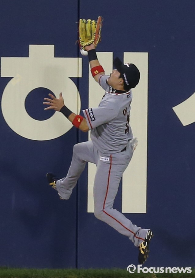 | △ 펜스를 타고 오르는 이용규 |