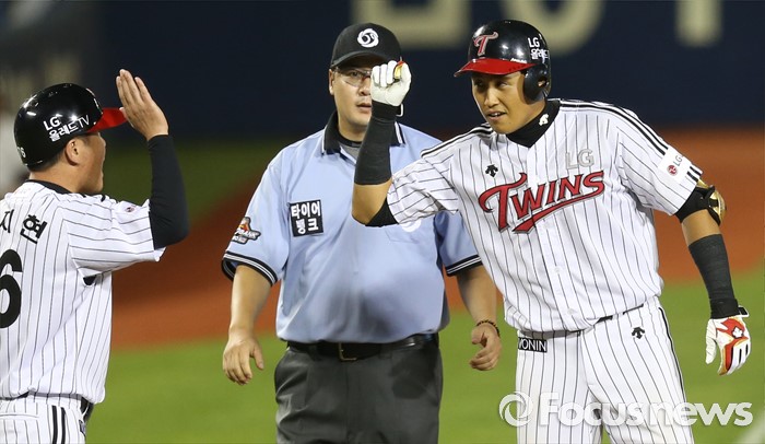 (서울=포커스뉴스) 12일 서울 잠실구장에서 열린 2016 프로야구 한화-LG 경기 7회말 2사 1,2루에서 LG 채은성이 역전 2타점 우중간 3루타를 치고 유지현 코치의 축하를 받고 있다.