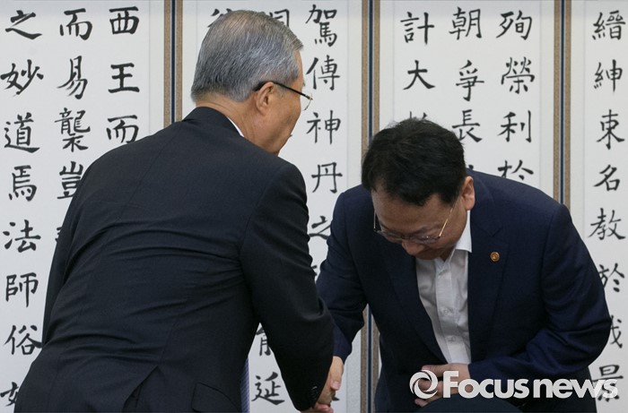 (서울=포커스뉴스) 13일 오전 서울 여의도 국회 귀빈식당에서 열린 더불어민주당 저출산 해소를 위한 국민연금 공공투자 특별위원회 1차 정책협의회에 참석한 김종인(왼쪽) 비대위 대표와 유일호 경제부총리 겸 기획재정부 장관이 인사하고 있다.