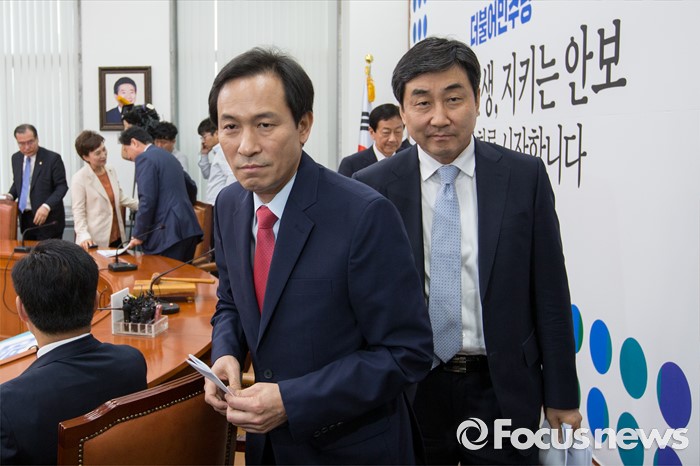 (서울=포커스뉴스) 우상호(왼쪽) 더불어민주당 원내대표와 이종걸 전 원내대표가 13일 오전 서울 여의도 국회에서 열린 비상대책위원회의를 마친 뒤 회의실을 나서고 있다.