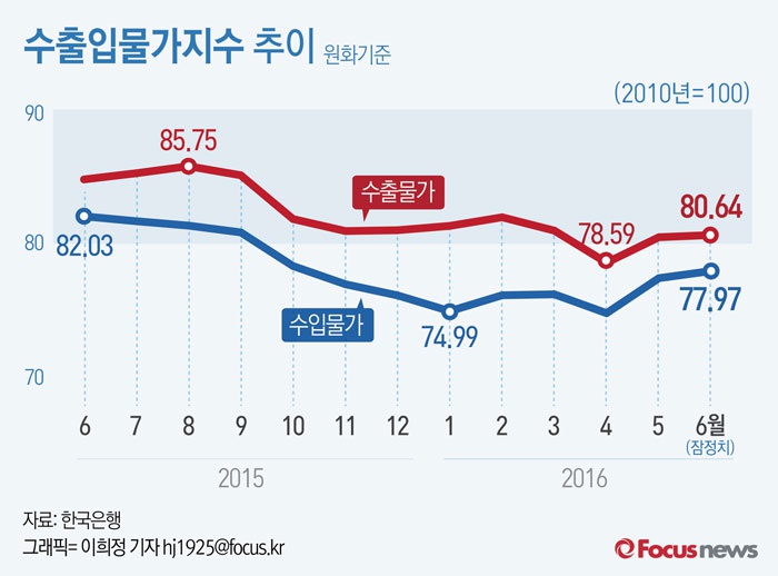 (서울=포커스뉴스) 한국은행이 12일 공개한 '2016년 6월 수출입물가지수'를 보면 지난달 수출물가지수는 80.64로 지난달보다 0.2% 상승했다. 같은 기간 수입물가지수도 국제유가 상승에 영향받아 77.97을 기록했다.