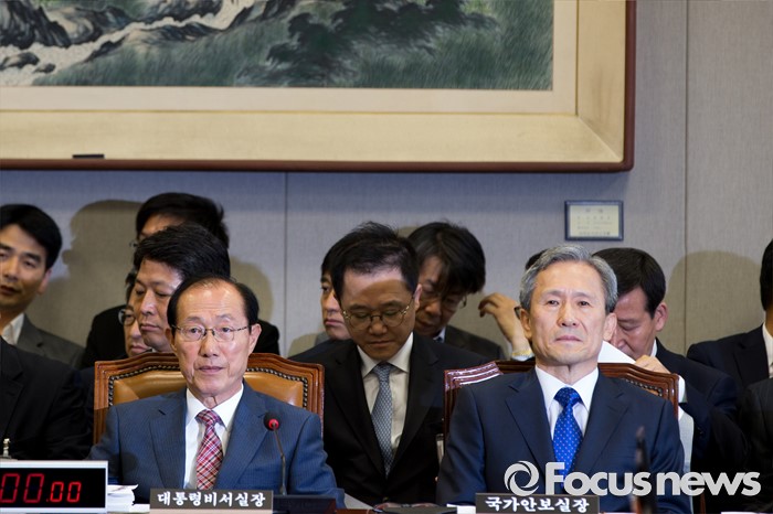 (서울=포커스뉴스) 이원종(왼쪽) 대통령비서실 비서실장과 김관진 국가안보실장이 13일 오전 서울 여의도 국회에서 열린 '운영위원회 전체회의'에 참석하고 있다.