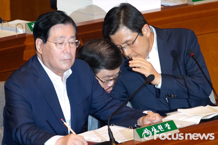 (서울=포커스뉴스) 13일 오전 서울 여의도 국회에서 열린 예산결산특별위원회 전체회의에 참석한 황교안(오른쪽) 국무총리와 황희종(가운데) 국방부 기획조정실장이 대화하고 있다. 왼쪽은 황찬현 감사원장.