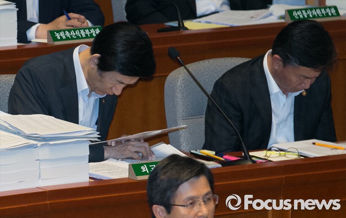 (서울=포커스뉴스) 13일 오전 서울 여의도 국회에서 열린 예산결산특별위원회 전체회의에 참석한 윤병세(왼쪽) 외교부 장관, 홍용표 통일부 장관이 자료를 살펴보고 있다.
