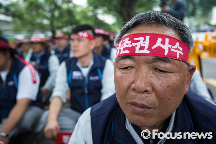 (서울=포커스뉴스) 13일 오전 서울 여의도 산업은행 본점 앞에서 삼성중공업 노동자협의회 관계자들이 고용안정 요구 및 정부의 조선업 구조조정을 규탄하는 상경 집회를 하고 있다.