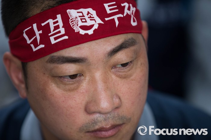 (서울=포커스뉴스) 13일 오전 서울 여의도 산업은행 본점 앞에서 삼성중공업 노동자협의회 관계자들이 고용안정 요구 및 정부의 조선업 구조조정을 규탄하는 상경 집회를 하고 있다.