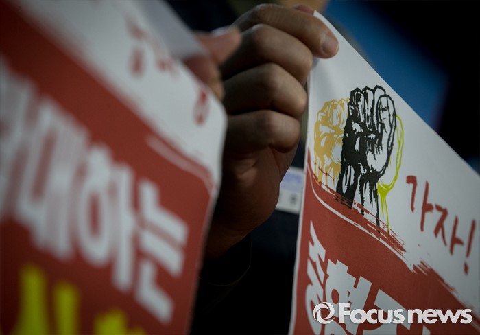 (서울=포커스뉴스) 13일 오전 서울 여의도 국회 정론관에서 조선업종노조연대 등 관계자들이 일방적 구조조정에 반대하는 총파업 선언 기자회견을 하고 있다.