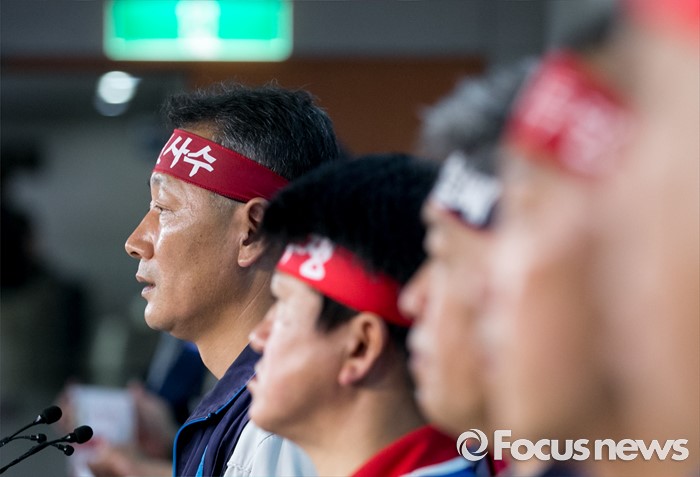 (서울=포커스뉴스) 13일 오전 서울 여의도 국회 정론관에서 조선업종노조연대 등 관계자들이 일방적 구조조정에 반대하는 총파업 선언 기자회견을 하고 있다.
