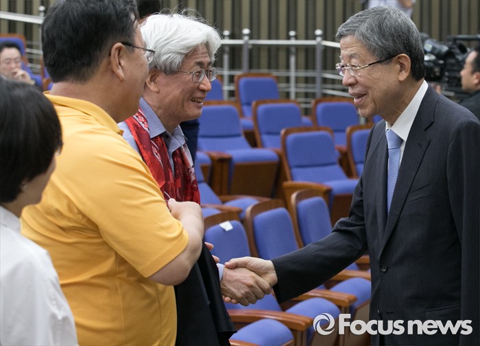 (서울=포커스뉴스) 13일 오후 서울 여의도 국회에서 열린 포용적 시장경제와 새누리당의 진로 토크 콘서트에 참석한 김희옥(오른쪽) 혁신비대위원장과 발제를 맡은 복거일 작가가 악수하고 있다.