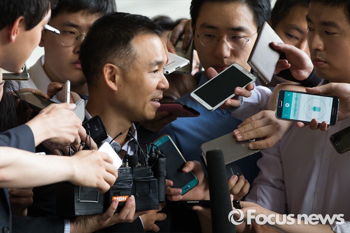 (서울=포커스뉴스) 진경준 검사장의 '주식대박' 의혹과 관련해 넥슨 창업주 김정주 NXC(넥슨지주회사) 회장이 13일 오후 서울 서초구 서울중앙지방검찰청으로 들어서기 전 취재진의 질문을 받고 있다.