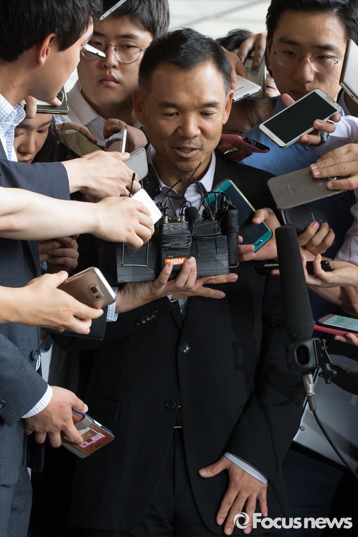 (서울=포커스뉴스) 진경준 검사장의 '주식대박' 의혹과 관련해 넥슨 창업주 김정주 NXC(넥슨지주회사) 회장이 13일 오후 서울 서초구 서울중앙지방검찰청으로 들어서기 전 취재진의 질문을 받고 있다.