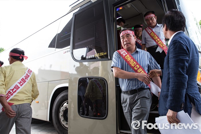 (서울=포커스뉴스) 국방부가 사드 배치 지역을 경북 성주로 확정지은 13일 오후 서울 용산구 국방컨벤션을 찾은 김항곤 군수와 군민들이 항의하기 위해 버스에서 내리고 있다.